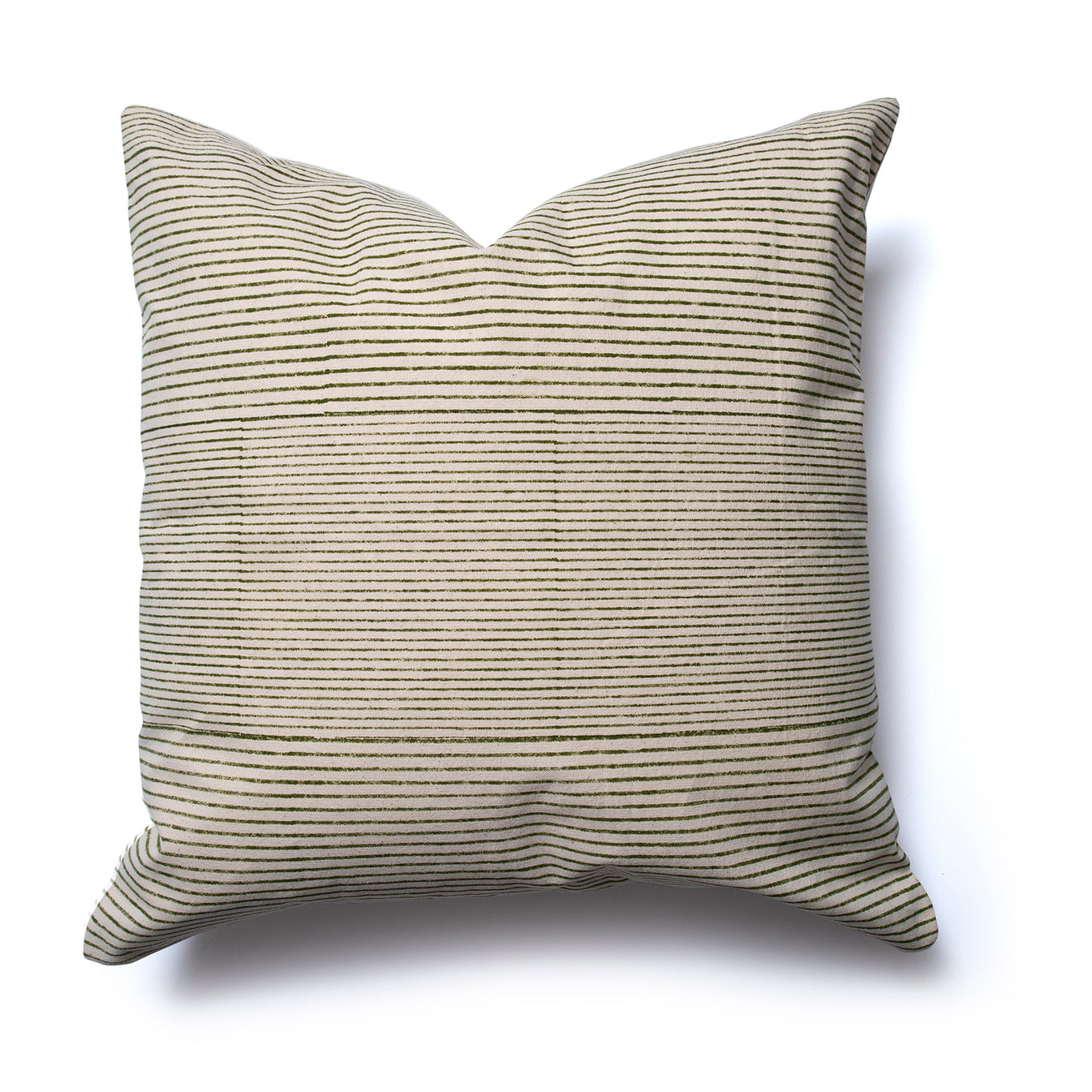Felip es una funda de cojín de algodón grueso premium color crudo con rayas verdes por delante y sólido color crudo por atrás. Estampado a mano en India, con técnica de bloques de madera.