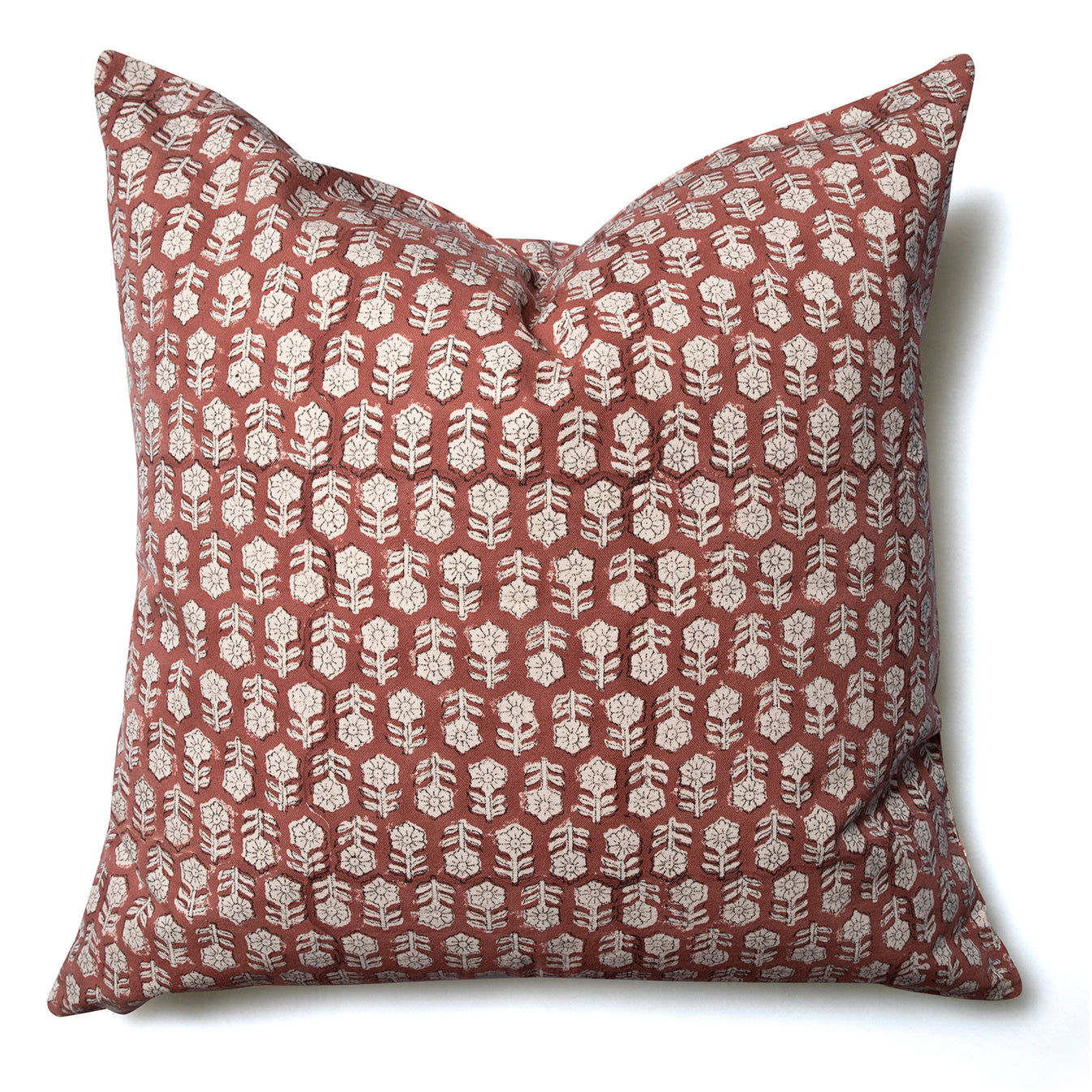 Nina es una funda de cojín de color burdeo con flores beige por ambos lados. Estampado a mano en India con técnica de bloques de madera, sobre una tela de algodón grueso premium.
