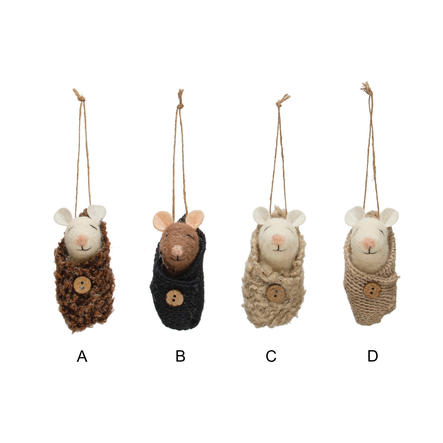 Adorno colgante de árbol de navidad de ratoncito envuelto en manta. Son 4 ratoncitos diferentes, se venden por separado.