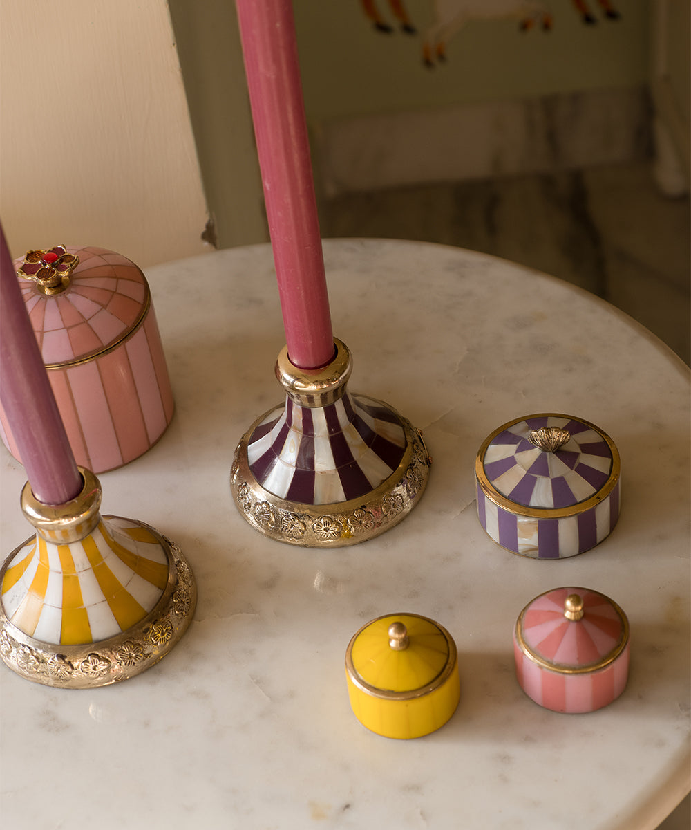 Ilumina tu espacio con la Caja Bailey Amarilla. Dale un toque de color y encanto a tu interior, una caja de almacenamiento bellamente elaborada a mano que combina un diseño alegre con una elegancia refinada. Con su vibrante acabado amarillo, tapa abovedada y detalles de bronce dorado pulido, este joyero compacto (5 x 5 x 5 cm) es ideal para guardar anillos, aros, bisutería y otros objetos preciosos.