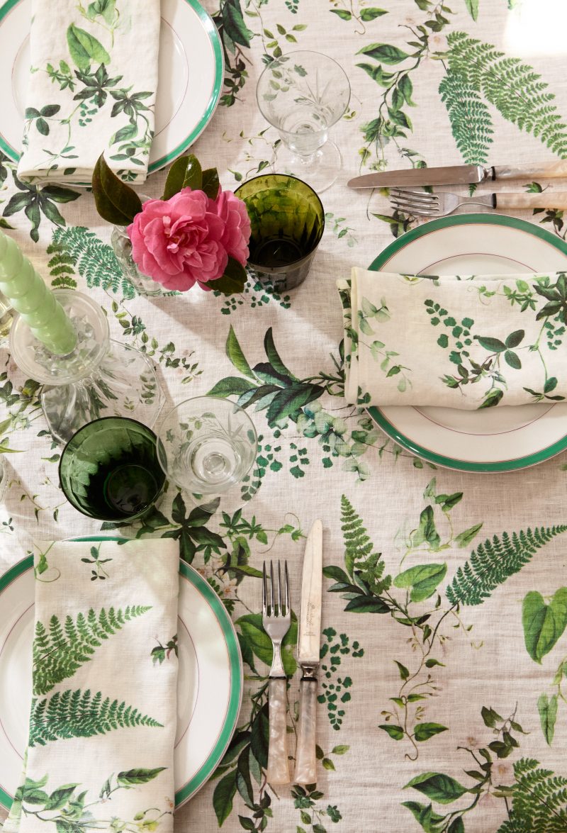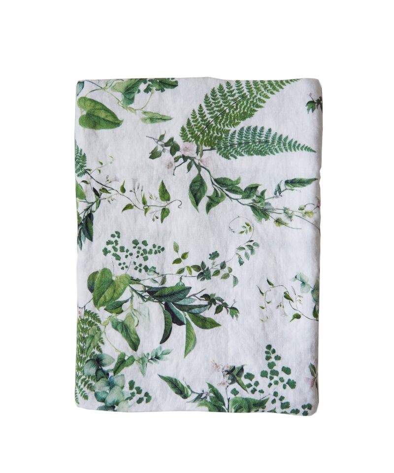 El mantel estampado Eden, trae la naturaleza a tu hogar y adorna tu mesa de comedor con helechos y follaje.