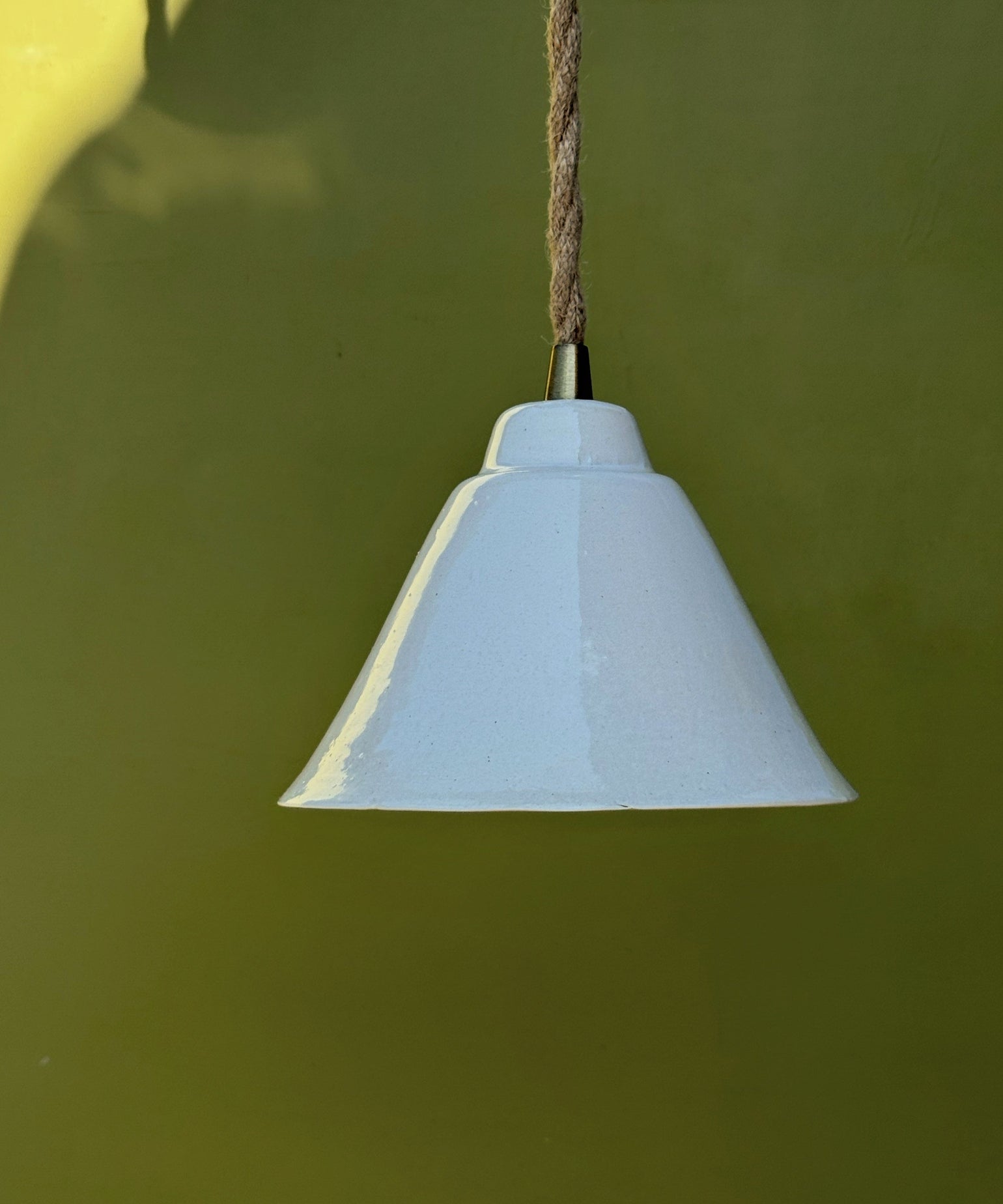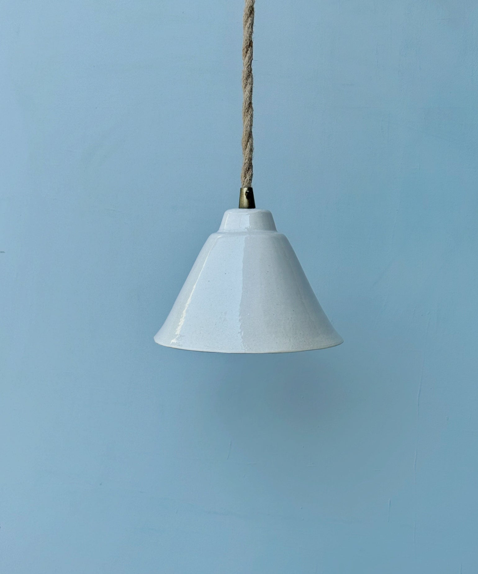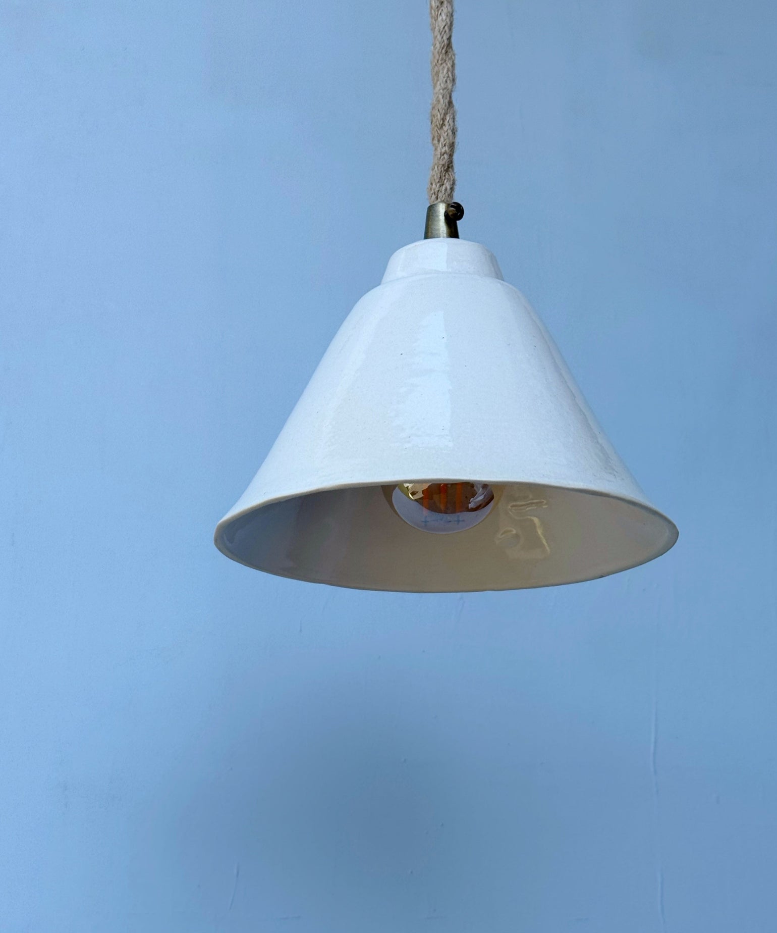 Lámpara Colgante de Cerámica gres color blanco brillante, incluye soporte de techo metálico  y cable trenzado de yute natural.